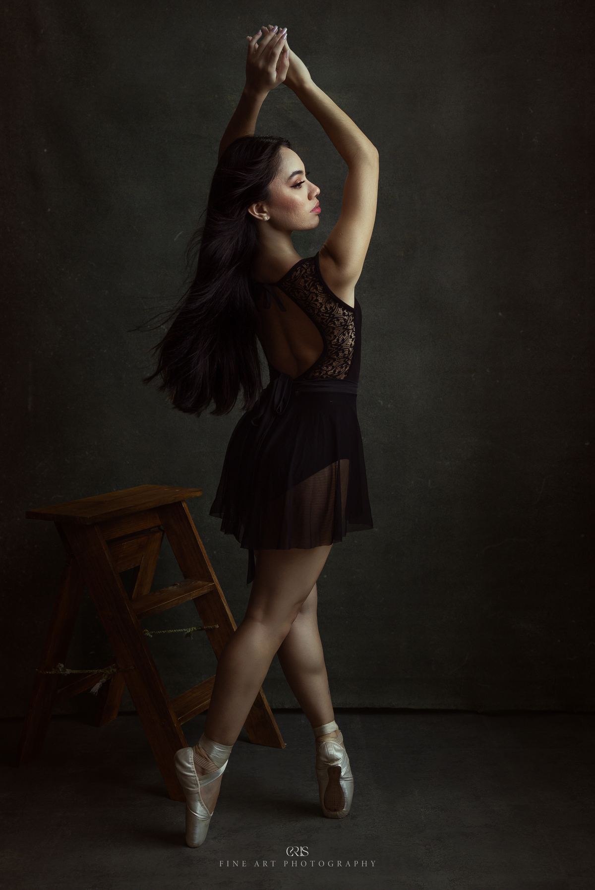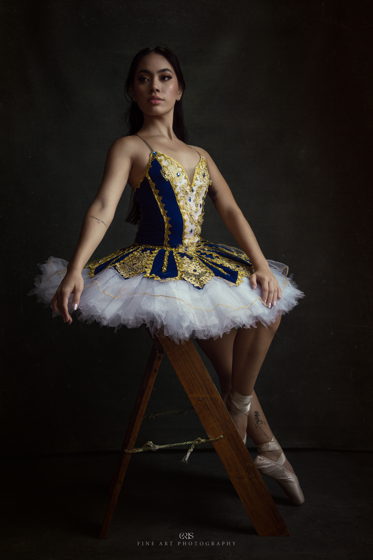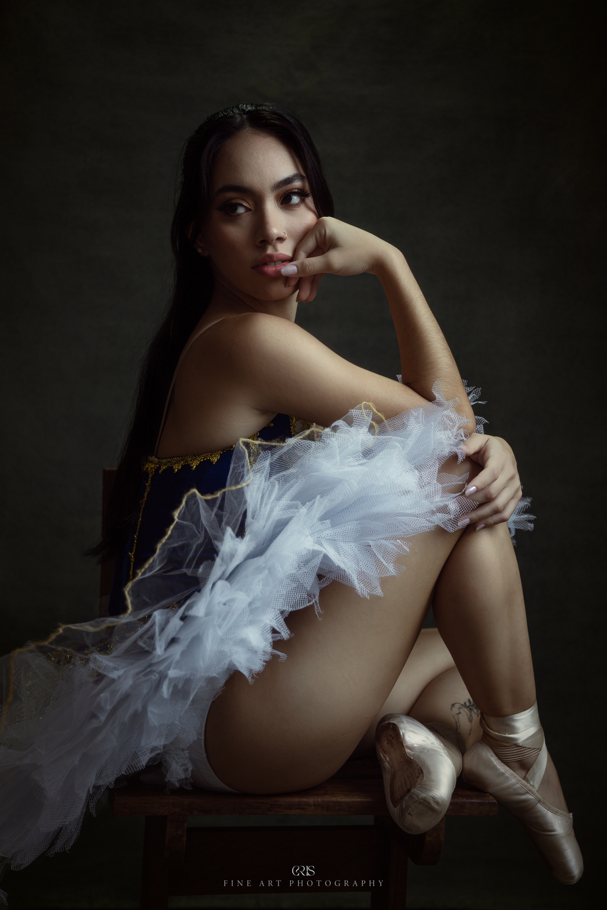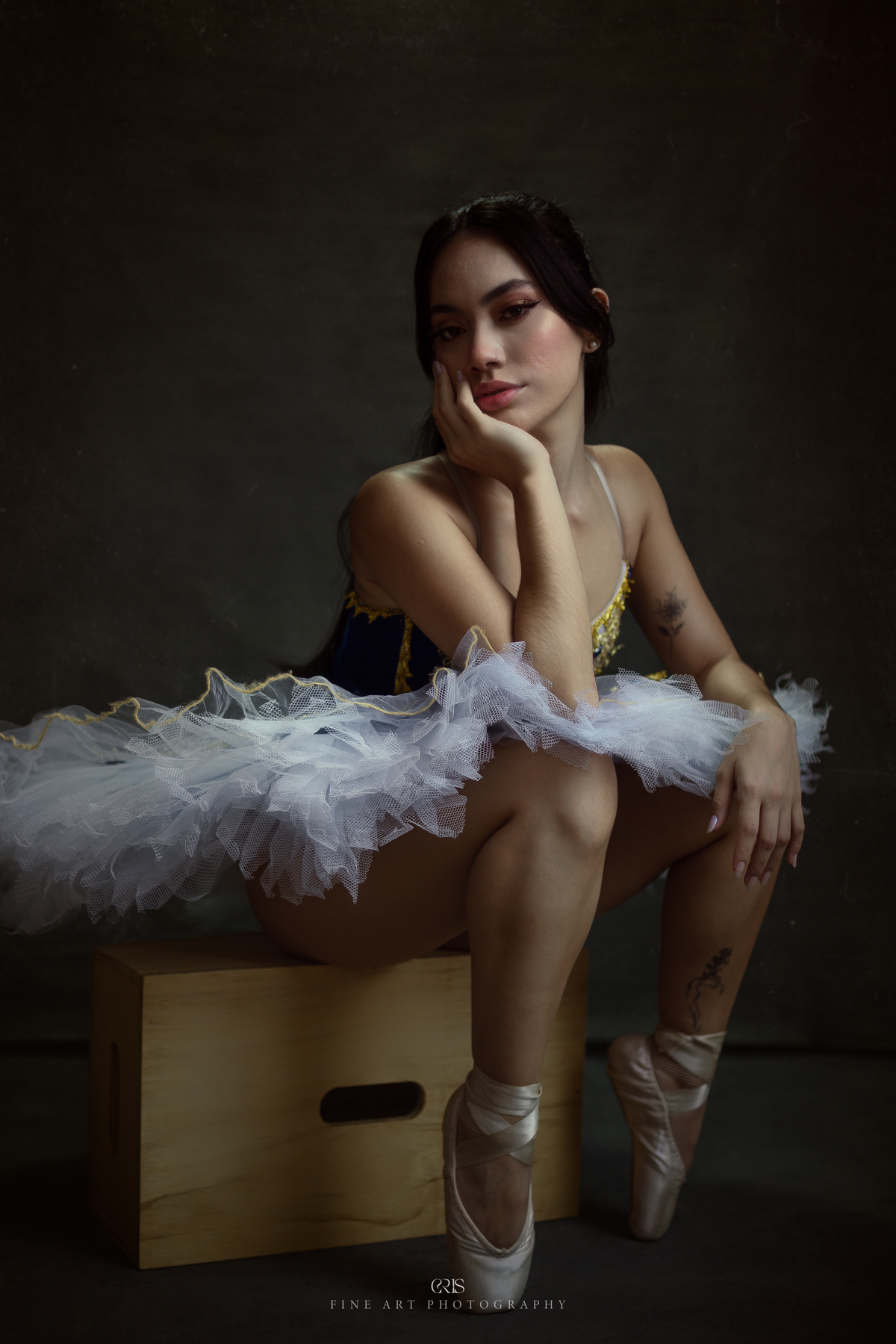 Seu corpo, esculpido pela dança, carrega a leveza de quem desliza entre o real e o etéreo. O jogo de luz e sombra acentua suas formas com delicadeza, realçando a dualidade entre força e fragilidade, entre presença e sonho. Há um silêncio que fala, um instante que respira, como se a fotografia não fosse apenas uma imagem, mas uma pausa entre os compassos de uma melodia invisível.