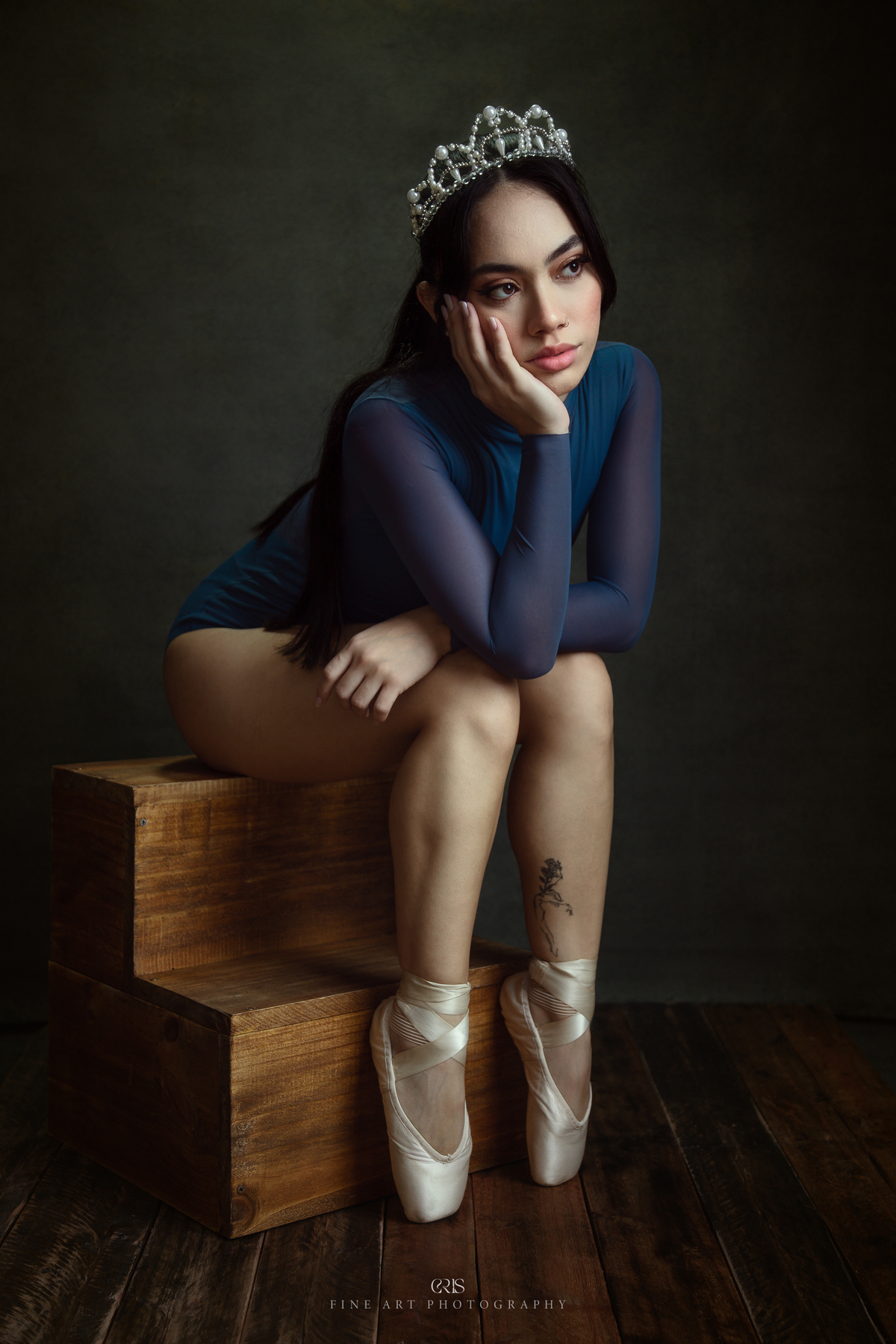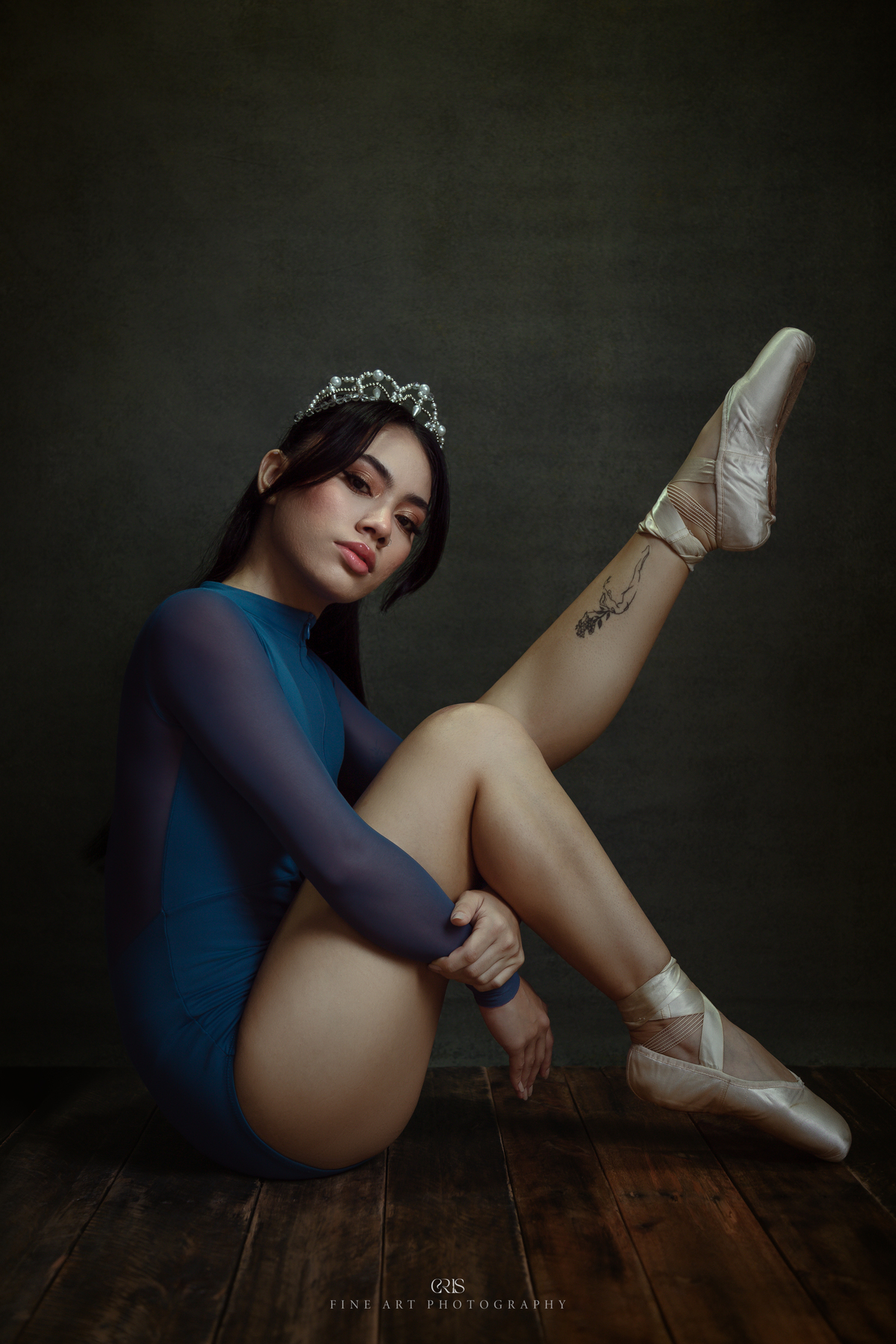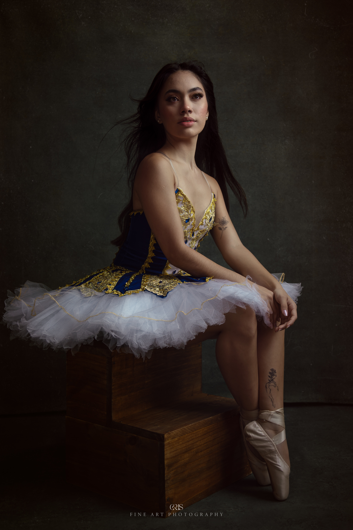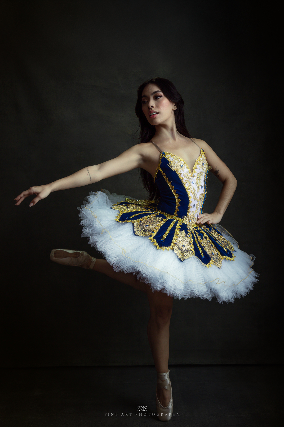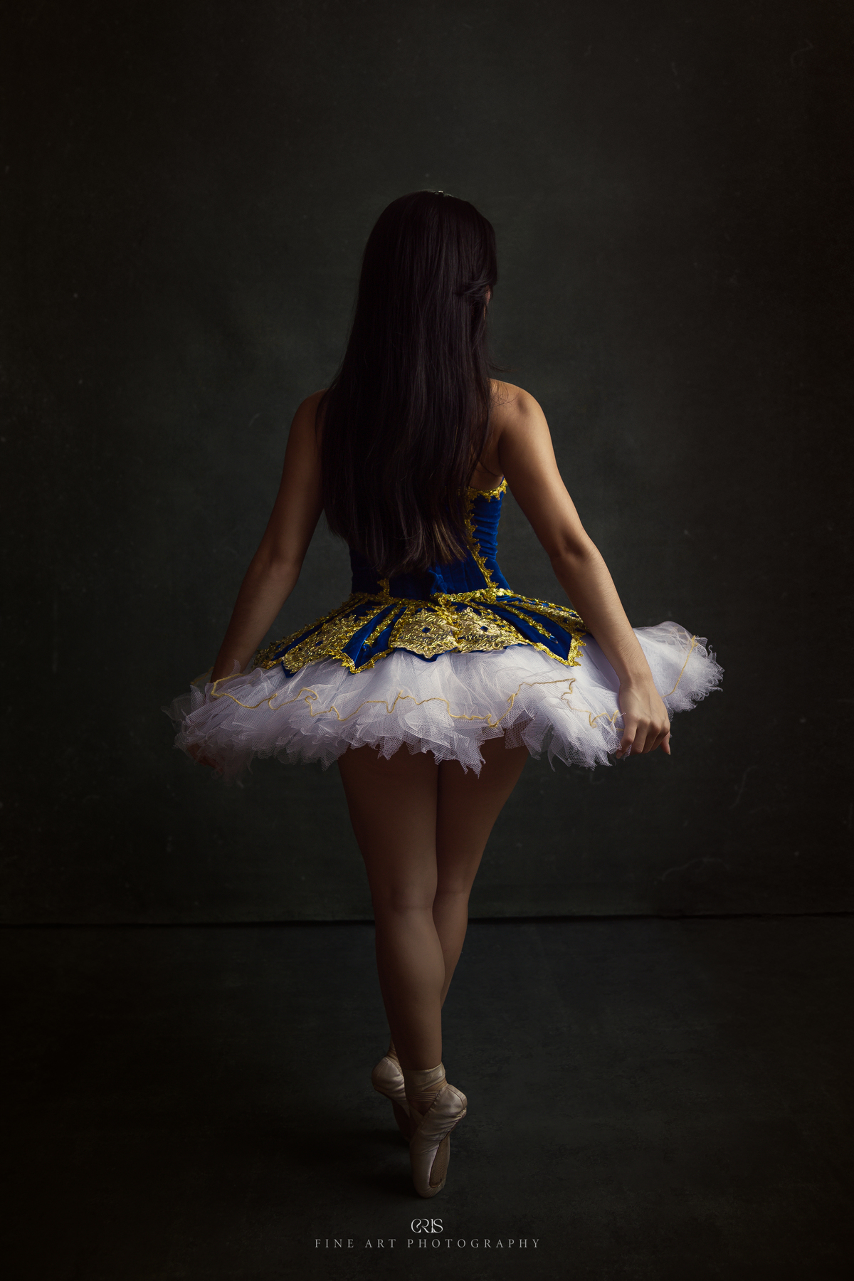 Seu corpo, esculpido pela dança, carrega a leveza de quem desliza entre o real e o etéreo. O jogo de luz e sombra acentua suas formas com delicadeza, realçando a dualidade entre força e fragilidade, entre presença e sonho. Há um silêncio que fala, um instante que respira, como se a fotografia não fosse apenas uma imagem, mas uma pausa entre os compassos de uma melodia invisível.