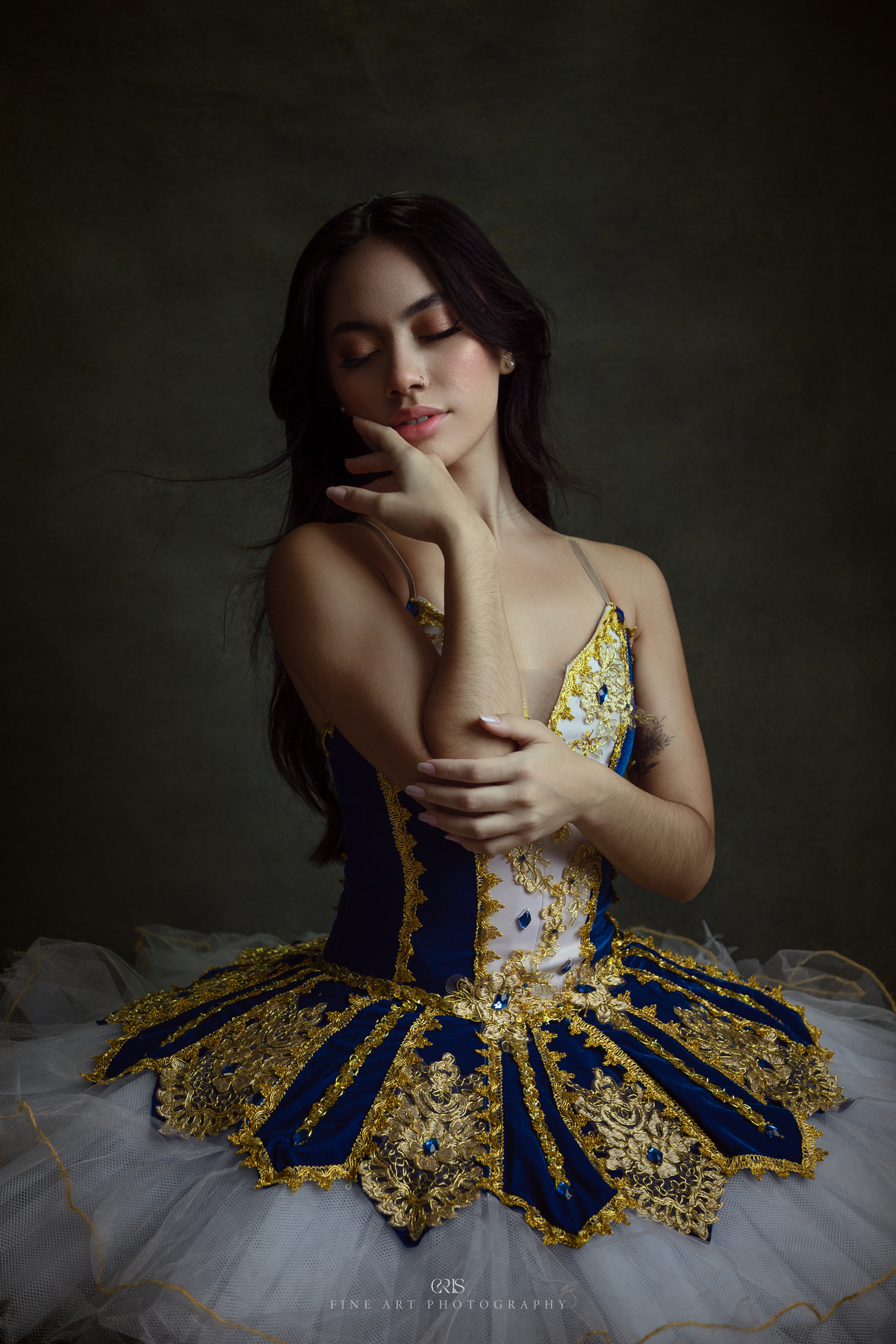 O retrato captura a beleza atemporal de uma bailarina suspensa no instante, como se o próprio tempo tivesse feito uma reverência diante de sua graça. Sua expressão, suave e tranquila, reflete a serenidade de alguém que encontrou no movimento a mais pura forma de liberdade. No entanto, há um mistério sutil em seu olhar — um segredo guardado entre os fios escuros de seus cabelos, que emolduram sua pele clara e macia como a mais delicada das telas.