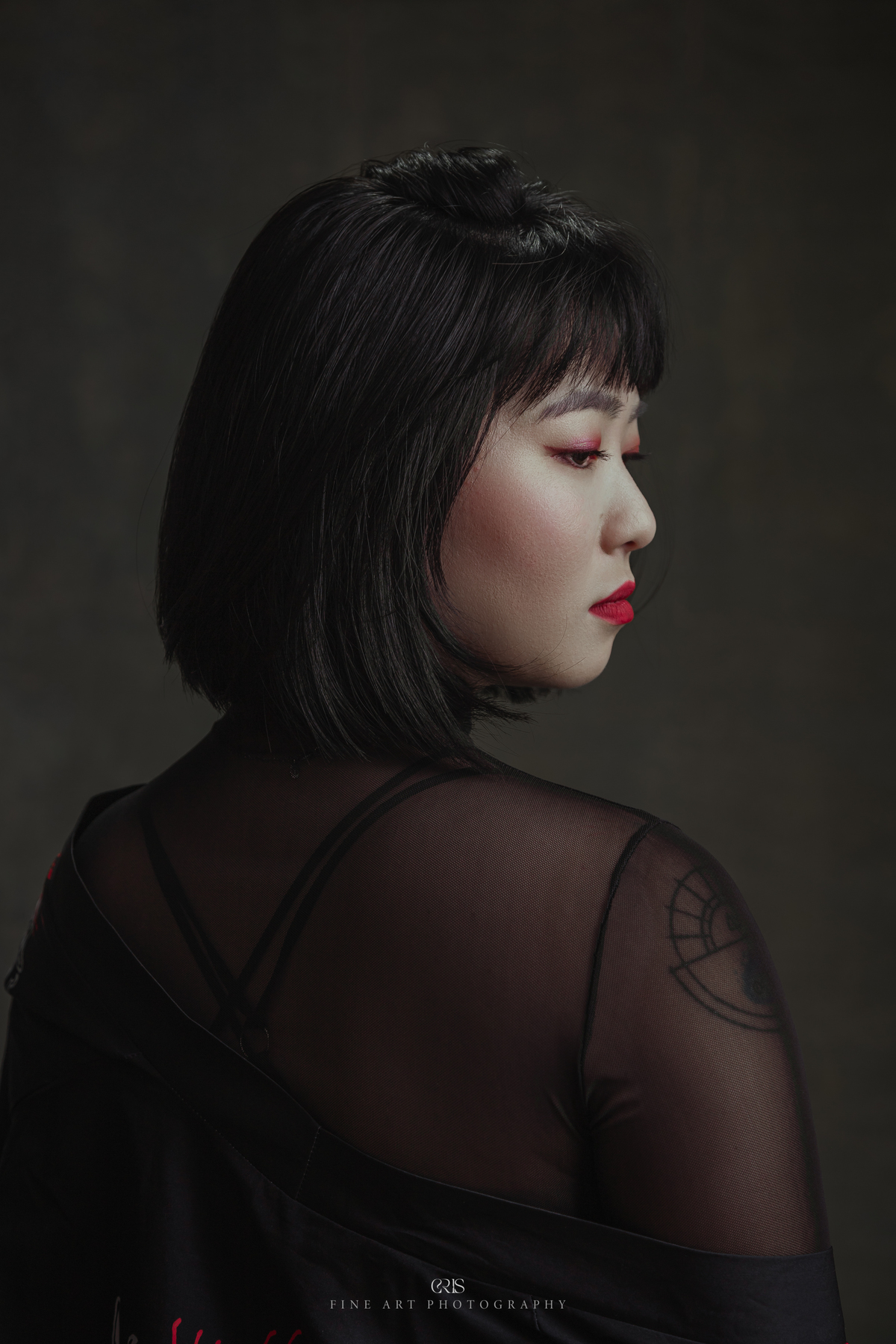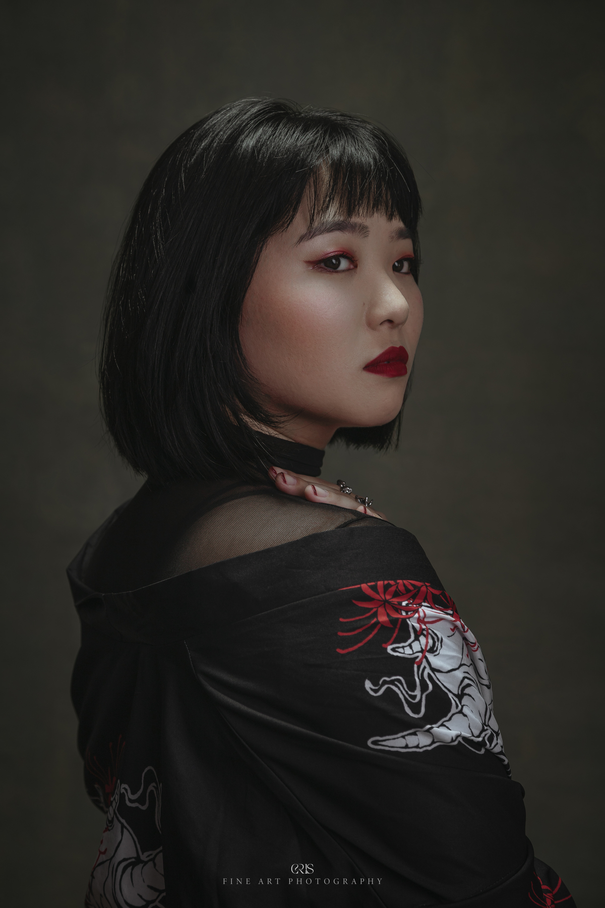 com seus cabelos pretos, que caem com leveza ao redor do rosto claro,