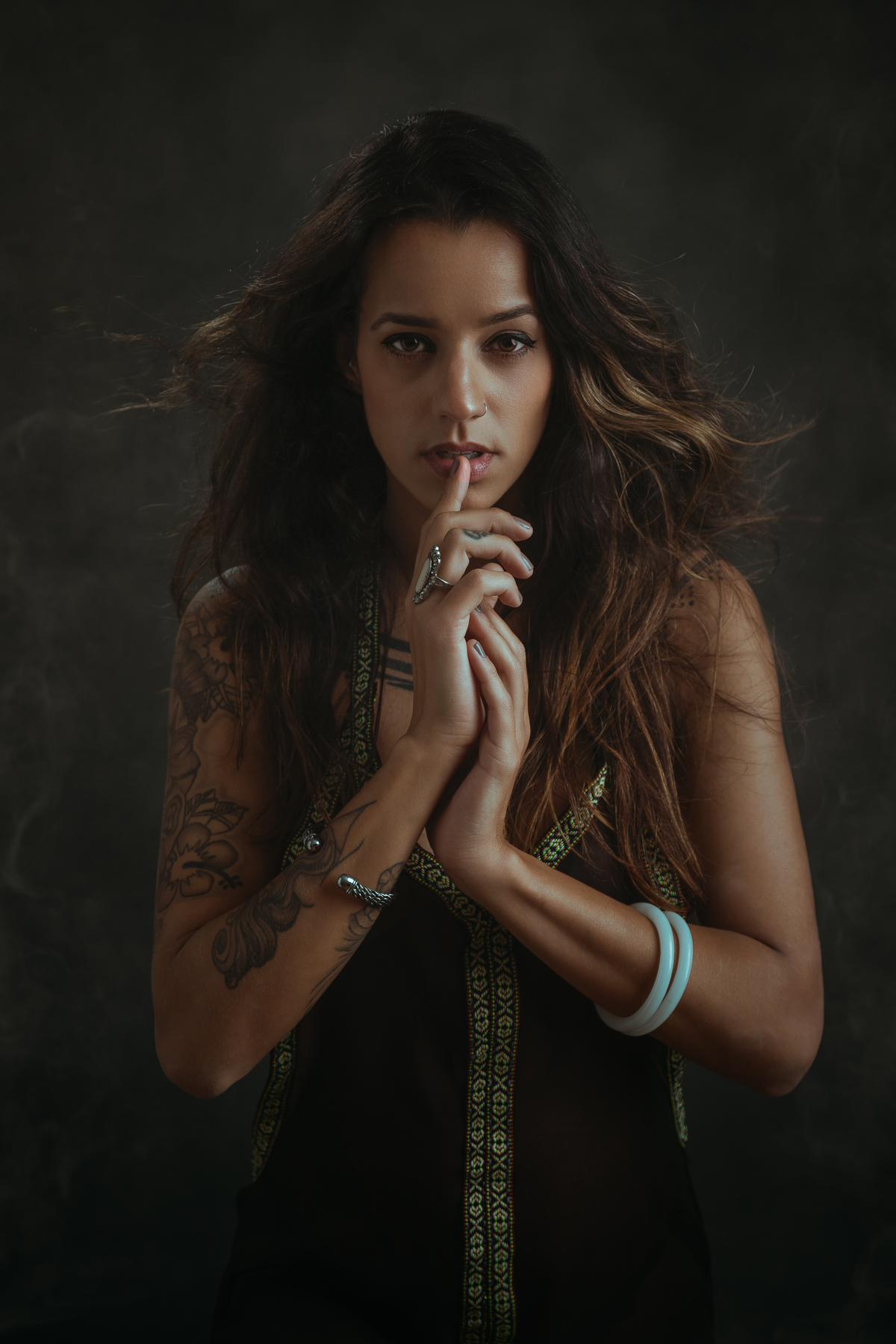Seu cabelo dança com o vento, como preces ao invisível.