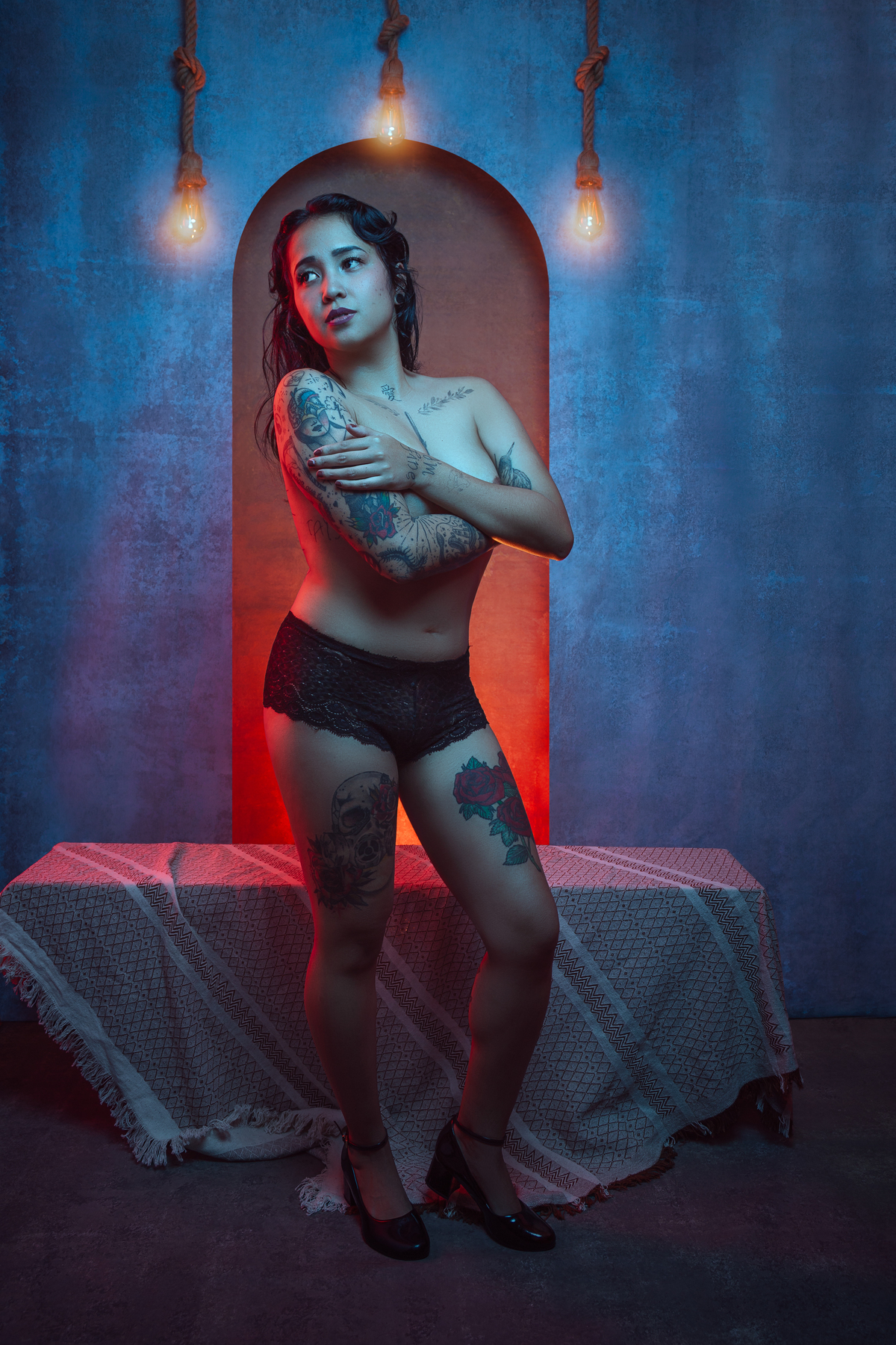 Entre flores que florescem na pele e ondas que dançam em seus quadris, pulsa a essência de quem sabe ser abrigo e tempestade.